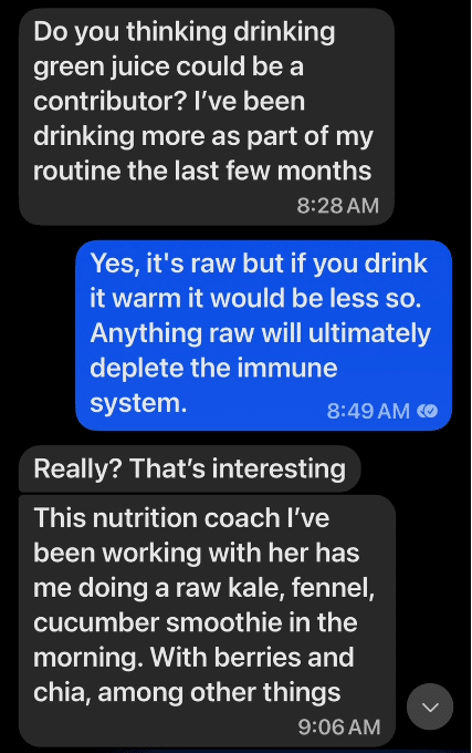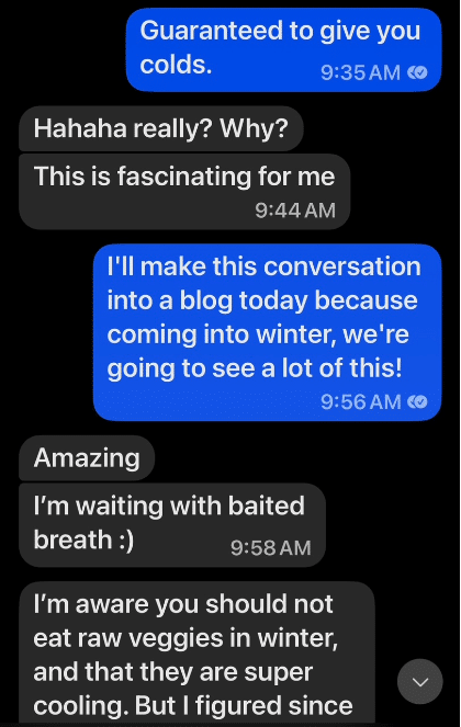 The movement of yang, or kidney yang to be more specific, or in western terms, adrenaline, is exciting. People will tell you that their smoothies make them feel so clear and alive and ready to go, but all that sensation is a response to the damage the cold is bringing.