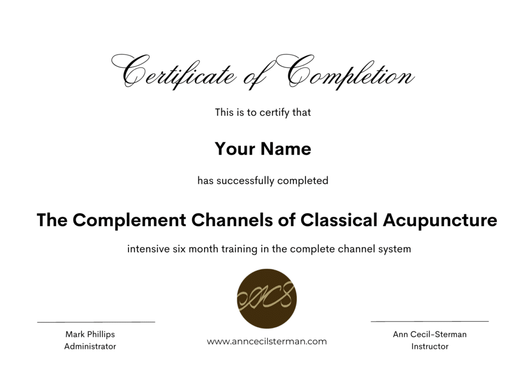 At the conclusion of this mentorship you will receive a certificate of completion. If you attend two live classes with Ann (since July 2021) you will receive a certificate of certification in the practice of Classical Acupuncture